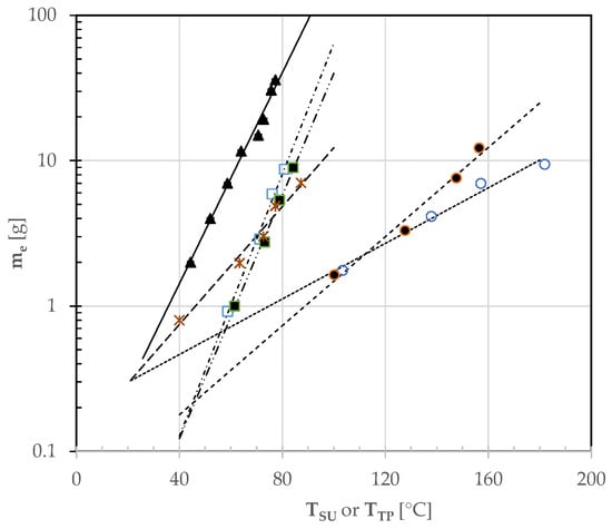 Semilogarithmic plot of the experimental amount of water evaporated (me) against the average sample temperature (TSU or TTP) measured during either the water heating test (▲, -) or different pizza baking tests (A: ○, …; B: ●, - - -; C: □, - . -; D: ■, —. .—; E: ✶, — —. The different regressions lines were calculated using Equation (1) and the empirical coefficients listed in Table S3.
