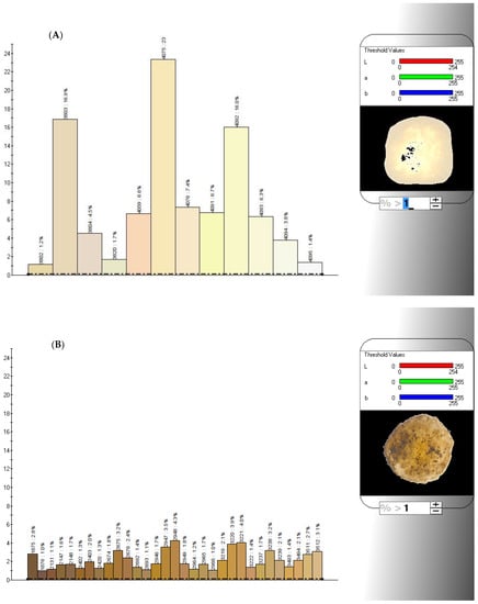 The formation of brown or black colored areas in pizza during its baking in the wood-fired oven, due to the appearance of brown or black pigments, was previously monitored using computerized image analysis techniques and related to the available lysine content [13]. By using the IRIS electronic eye, any digital image was processed as a color spectrum on a maximum scale of 4096 colors, each of these corresponding to a unique set of three values in the RGB space. The black color was represented by the decimal code (0, 0, 0), while the brown one by (165, 42, 42), as derived from https://www.rapidtables.com/web/color/RGB_Color.html (accessed on 14 February 2023).