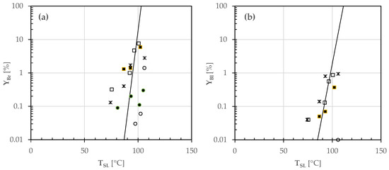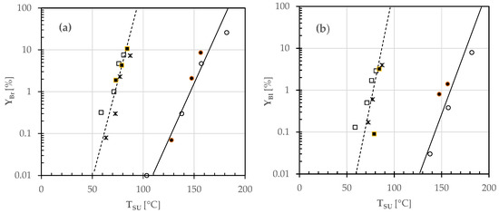 Semilogarithmic plot of the percentage degree of (a) browned (YBr) and (b) blackened (YBl) areas of the upper surface area of different pizza samples (A: ○; B: ●; C: □; D: ■; E: ✶) during baking in a wood-fired oven versus the corresponding temperature (TSU). The continuous and broken lines were the least squares regression lines estimated using Equation (2).