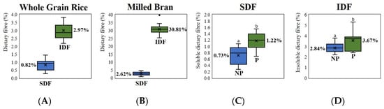 Overview of variation in SDF and IDF distribution (A) in whole grain rice samples varying from high amylose content (AC) to low AC, expressed as the percentage of total grain weight and (B) in milled bran samples expressed as the percentage of rice bran powder; the difference in (C) SDF or (D) IDF of whole grain non-pigmented (NP) and pigmented (P) rice, expressed as the percentage of total grain weight. Values with different letters are significantly different with p < 0.05.