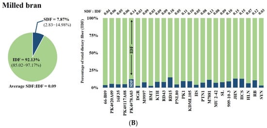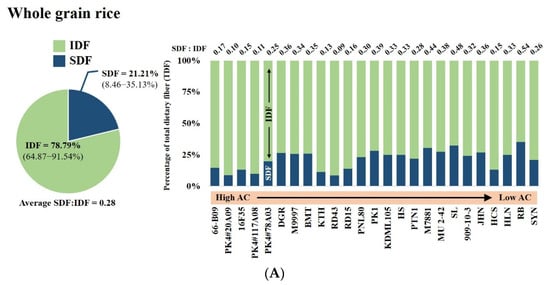Variation in dietary fibre profiles, SDF and IDF of (A) whole grain rice samples with different ACs and (B) milled bran samples, expressed as a percentage of TDF.