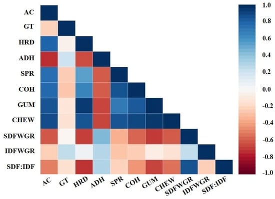 Pearson’s correlation matrix: correlation between amylose content, gelatinization temperature, textural parameters, and dietary fibre profiles. AC = amylose content; GT = gelatinisation temperature; HRD = hardness; ADH = adhesiveness; SPR = springiness; COH = cohesiveness; GUM = gumminess; CHEW = chewiness; SDFWGR = SDF in whole grain rice; IDFWGR = IDF in whole grain rice; SDF:IDF = SDF to IDF ratio of whole grain rice.