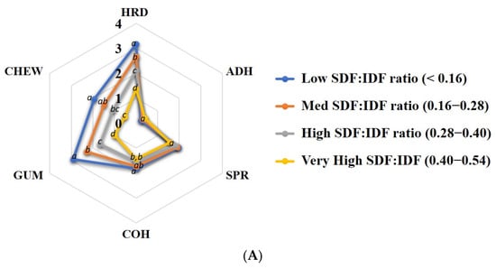 Furthermore, whole grain rice samples were grouped by the SDF to IDF ratio into a low ratio (<0.16), medium ratio (0.16–0.28), high ratio (0.28–0.40), and very high ratio (0.40–0.54), to associate with expected textural characteristics (Figure 6A). Based on the textural parameters (Table 1), the association between dietary fibre and the texture of cooked whole grain rice was established. Rice with a lower SDF to IDF ratio was harder, gummier, and chewier than rice with a higher SDF to IDF ratio. However, no statistical differences were detected in adhesiveness (p = 0.31) and springiness (p = 0.45) among the groups of cooked whole grain rice with different SDF to IDF ratios (Figure 6A). Thus, the SDF to IDF ratio of whole grain rice negatively correlates with the hardness, gumminess, chewiness, and cohesiveness of cooked whole grain rice.