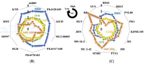 Two types of radar charts were developed to display the complex correlation among AC, SDF to IDF ratio, and textural characteristics of whole grain rice. The first one was designed to plot a series of the SDF to IDF ratio: low, medium, high, and very high over the average values of each TPA parameter (Figure 6A). The second one was developed to plot the values of TPA parameters—hardness, springiness, cohesiveness, and SDF to IDF ratio—across rice varieties with high-intermediated AC (Figure 6B) and with low AC (Figure 6C). The SDF to IDF ratio and TPA parameters were classified into four groups or 4-point scales using the following numerical rating: 1 = lowest and 4 = highest, as described in Table 1. Scaling was performed by dividing the difference between the maximum and minimum values in all samples by 4, based on the method described by Bernstein [] with modification.