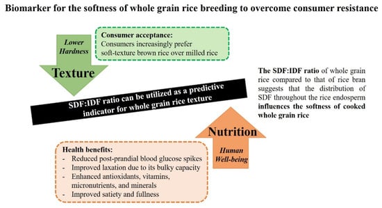 This study investigated the effects of dietary fibre profiles on the textural properties of cooked whole grain rice. Despite a slight variation in the dietary fibre composition of whole grain rice, the variation of SDF to IDF ratio in whole grain rice impacted the texture of cooked rice. Furthermore, this study demonstrated that the SDF to IDF ratio of whole grain rice was negatively correlated with hardness, cohesiveness, gumminess, and chewiness (p < 0.01) but positively correlated with the adhesiveness (p < 0.05) of cooked whole grain rice. This finding is helpful for future trends to improve softness and consumer acceptance of whole grain rice in indica rice (Figure 7). Furthermore, this study successfully developed a simplified approach to precisely predict dietary fibre profiles into fractions of whole grain rice using an alternative alkaline method that is practical for high-throughput screening of dietary fibre in precision rice breeding.
