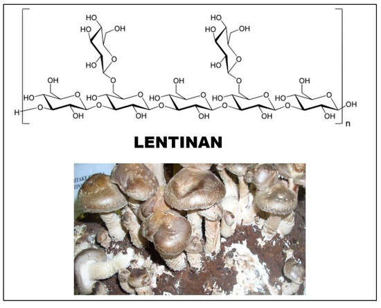 The source of lentinan is the fruiting body and mycelium of the Lentinula edodes (shiitake) mushroom. It was first isolated by Chihara’s group in 1970 [38]. The sugar chain of glucan consists of (1 → 3)-β-D-glucopyranoside units, and two (1 → 6)-β-D-glucopyranoside side chains are attached to every five such sugar units (Figure 3). The degree of branching (DB) value of the molecule is between 0.33 and 0.5. The molecular weight of lentinan was initially measured as 9.5–10.5 × 105, and then with another method, it was found to be lower, in the range of 3–8 × 105 [20].