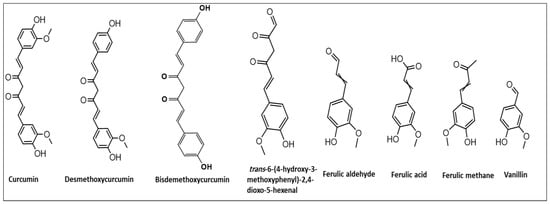 The universal spice turmeric, botanically named Curcuma longa, family Zingiberaceae, is well known as the curry-coloring spice. It is frequently used as the commonest food-additive throughout the globe. Its use is much prevalent in the oriental worlds of India, China, Indo-China, and the Mediterranean regions. The dried root powder of the plant is commercially available at groceries and spice shops. The herb powder is consumed for several culinary purposes to induce color, spiciness, taste, fragrance, and flavor [1]. The edible herbal powder possesses several biological activities, i.e., anticancer, antimicrobial, antiviral, anti-inflammatory, and wound-healing [2,3,4,5,6,7,8]. Curcuminoids are the main constituents in root powder and are considered responsible for the pharmacological efficacy of the powder. The primary constituents are curcumin, demethoxycurcumin, and bisdemethoxycurcumin [9], while different structural degradants have also been identified (Figure 1).