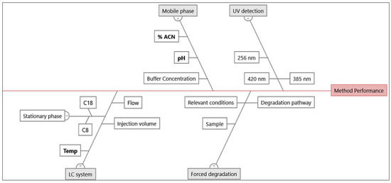 To identify the risk associated with the approach involving the CMPs in achieving the target analytical profile, an Ishikawa diagram (Figure 2) was developed [30]. It was determined that the pH of the mobile phase, column temperature, and the gradient mobile phase’s composition as the ratio of the organic solvent were among the critical parameters supporting the requisite. The DoE (Design of Experiment) methodologies were employed to study the suggested parameters (Table 1). These parameters, with their settings of the level of operation, were selected for the QRA.