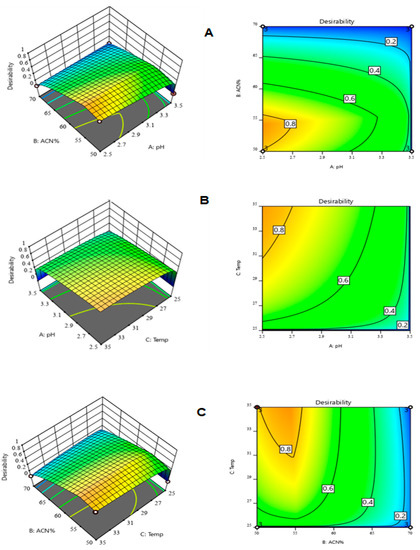 A 3D plot of Derringer’s desirability function in correlation with variable acetonitrile and pH (A), pH and temperature of the separation column (B), and temperature and acetonitrile composition % (C).