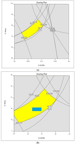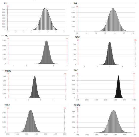The optimized design space overlaid (yellow) area (Figure 4a) was selected, corresponding to intersects, to choose the method’s operable design’s region (MODR), also defined by pH (2.5–2.9), temperature (32–35 °C), and the acetonitrile composition (54–57%) as represented in the blue box (Figure 4b. Monte Carlo simulations (Table 4) for the choice of the parameters validated these inputs, wherein the predictive errors were computed through the probability to reach the desired objectives of the experimental levels of the CMPs, as well as the accepted limits of the method’s attributes by evaluating the capacity index (Cpk) value of the process (Figure 5).
