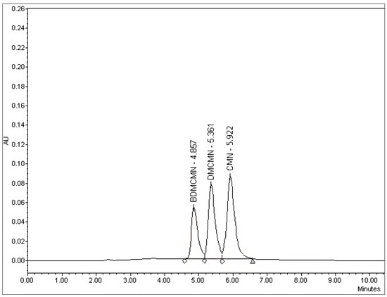 Curcuminoids are polyphenolic compounds composed of two differently placed ortho-methoxyphenyl moieties connected by an α,β-unsaturated-β-diketone structural part (Figure 1). At the neutral pH and RT, the curcuminoids are water-insoluble, but they exhibit solubility under alkaline conditions. The products are relatively unstable and degrade rapidly upon exposure to sunlight as well as at neutral and alkaline conditions. However, the products are comparatively more stable under acidic conditions [25]. The environmental, naturally initiated, and forced-degradation products were identified as vanillin, ferulic acid, ferulic aldehyde, and ferulic (feruloyl) methane, together with auto-oxidized dicyclopentadiene as the degradants in the curcuminoids powder. The relative concentrations of these degradants differed according to the conditions, and durations of the conditions of pH and temperature, as also observed earlier [26]. The lipophilic nature, the levels of lipophilicity, solubility behavior, partition coefficients of the products, and degradants played an important part in the separation of these components in the powdery mixture analysis. A better understanding of the retention times of the products was assessed by the MarvinSketch® software v 20.11.0. (Marvin (chemaxon.com), which predicted the lipophilicity, log P, and distribution coefficients, log D, of the curcuminoid products. The curcumin showed log P at 4.12, log D at 3.76, the demethoxycurcumin’s log P at 4.28, and log D at 3.92, while the bisdemethoxycurcumin’s log P was predicted to be 4.44, and log D was predicted as 4.44, which suggested the elution order of these products from the RP-HPLC, wherein the bisdemethoxycurcumin suggested to be eluted first, followed by demethoxycurcumin, and lastly the curcumin. The predicted values of log P and log D for the expected degradations ranged between 1.18 and 2.14, and 1.22 and 2.14, respectively, and it was indicated that the low polarity degradation products would elute before the curcuminoid products [27]. As mentioned, the acidic pH is better at solubilizing, and is suitable for best separation on the RP-HPLC column owing to the higher pKa values; e.g., for curcuminoids, it ranged from 8.38 to 10.41. Furthermore, a literature survey revealed that pH 3.0 was frequently used for the separation of curcuminoids [24,28]. Henceforth, a range of pH between 2.5 and 3.5 was chosen for further investigations. Preliminary experimentations on ACN, and methanol, as an organic modifier of the mobile phase, showed better results with ACN. Potassium phosphate was tested as a buffer, and a 10 mM concentration was selected for the separation purpose. The influence of the maximum wavelength absorbance and mobile phase flow rate was examined, and the best results were obtained at a 1.0 mL min−1 flow rate with 385 nm wavelength for detection.