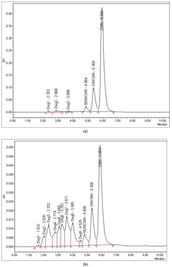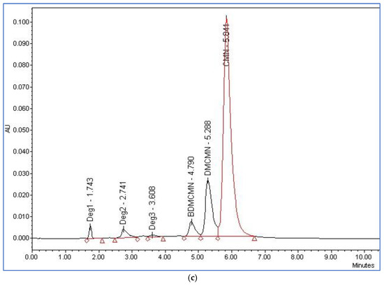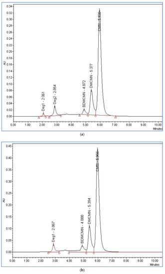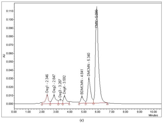 The forced-degradation studies were also carried out on the curcumin powder’s extract to produce the possible degradants and test their chromatographic behavior using the developed HPLC method in a simultaneous run of the method, and check its workability under the presence of other degradant materials obtained through various degrading conditions. The acid-induced degradants (Figure 7a) showed small-scale degradation (4.92%) with degradation peaks at 2.06 and 2.85 min, while the base-catalyzed degradation products were represented in Figure 7b, wherein a high level of degradation (79%) was observed, which also produced a new peak at 2.86 min.