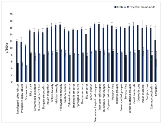 The protein content, calculated as the sum of amino acids minus the molecular weight of water, was relatively constant among all fish species (Figure 2), varying between 13 and 17 g/100 g. Crustaceans had a lower protein content of approximately 11–12 g/100 g. The total amount of essential amino acids (EAAs) constituted half of the protein content for all species (Figure 2).