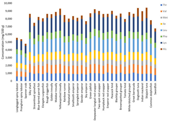 The distribution of EAAs was similar for all fish species (Figure 3), with leucine and the commonly limiting amino acid lysine being the most abundant amino acids (1500–1700 mg/100 g and 1800–2000 mg/100 g, respectively). These two amino acids were also the most abundant in crustaceans, although their contributions were slightly lower than in fish. The concentrations of histidine were highly variable among the 33 studied species (from 250 to 1350 mg/100 g), with the highest relative content being measured in tunas and mackerels. The contents of threonine (776–1093 mg/100 g), valine (867–1091 mg/100 g), methionine (450–697 mg/100 g), isoleucine (799–1071 mg/100 g), and phenylalanine (650–908 mg/100 g) were higher in the fish species compared with the crustaceans (on average 569, 646, 402, 623, and 578 mg/100 g, respectively).
