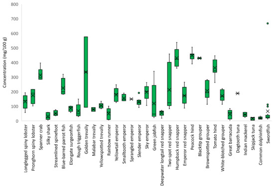 Taurine concentration (mg/100 g) in species caught in the Seychelles waters. Mean values are represented by an ×, median values are represented by −, the boxes cover the interquartile range, and the whiskers represent the minimum and maximum values without outliers. Outliers are plotted as individual points.