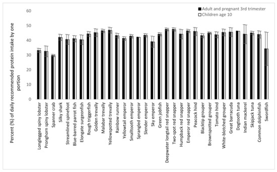 The Codex nutritional reference values for protein are based on the best available scientific knowledge of the daily amount needed for good health (830 mg protein/kg body weight for adults and 910 mg kg body weight for children). Based on these reference values and considering a portion size of 150 g for adults and 75 g for children, the contributions of one portion of each capture fishery species to the recommended dietary intake (RDI) for a 65 kg adult person, a 65 kg pregnant woman in the third trimester, and a 10-year-old child (average body weight of 30 kg) were estimated (Figure 5). One portion of swordfish and crustaceans (spiny lobster and spanner crab) would cover 30% of the adult, pregnant woman, and child RDIs. All other species would contribute 40–45% of these RDIs.