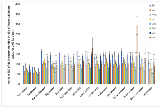 The FAO and WHO have recommended the dietary intake of each of the indispensable amino acids, based on growth and nitrogen balance. The percentage coverage of each of these amino acids for a 65 kg person by a 150 g portion of different species is illustrated in Figure 6. One portion of crustacean from the Palinuridae (spiny lobster) and Raninidae (spanner crab) families covered 50% of phenylalanine; 60–67% of valine, leucine, isoleucine, and histidine; and 90% of threonine, methionine, and lysine. One portion of fish covered approximately 70% of the daily recommended amount of phenylalanine and around or above 100% of the daily recommended amount of the other indispensable amino acids.