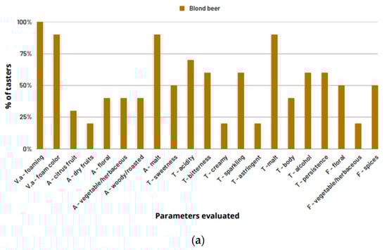 Figure 1 shows the percentage of citations of each descriptor obtained after data analysis of the DA test tasting report for beer, wines, and brandies obtained with the help of the first panel (P1) composed of 11 individuals. Descriptors with percentages inferior to or equal to 10% were discarded. Despite the reduced number of tasters, the DA test was chosen because it was only intended to verify which attributes, from the list of attributes presented for each type of beverage, were identified by the tasters. For the blonde beer (Figure 1a), the descriptors that present the higher percentage of citations (higher than 60%) are “foaming” and “foaming color”, “malt aroma”, “acidity”, “bitterness”, “sparkling”, the mouthfeel sensation of bubbles, and “malt taste”.