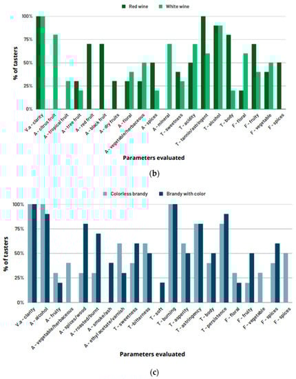 Percentage (%) of P1 tasters by parameters evaluated for beer (a), wines (b), and brandies (c) (Va—visual aspect; A—aroma; T—taste/texture; F—flavor).