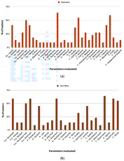 To better understand what the tasters’ reaction was regarding the sensory analysis of alcoholic beverages, a more specific descriptive analysis was carried out for red wine (with more descriptors to be evaluated), as shown in Figure 2a, and another typical Portuguese beverage was taste-tested, port wine, as shown in Figure 2b. For this second sensory analysis, a second panel (P2) of 22 tasters was used.