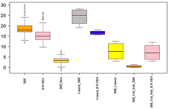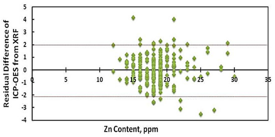 According to the results, the reference sample of BRRI dhan had a mean difference between XRF and ICP-OES of 7.7 ppm (Figure 2). Furthermore, the mean difference in the Zn concentration of BRRI dhan using XRF with reference published data was 0.48, whereas ICP-OES showed a difference of 7.23 ppm when compared to published data (Table A1). The reason behind the high mean difference in Zn concentration between these two techniques may be due to the monitor indicators of ICP-OES analysis to detect contamination, which is not possible with XRF [18,26,27].