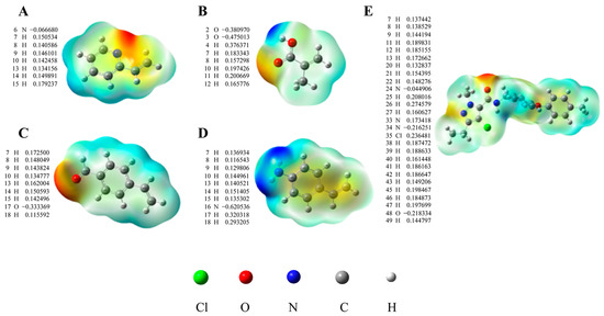 MEP distributions and surface charges of 2-VP (A), MAA (B), 4-VB (C), 4-VA (D), and tolfenpyrad (E) after optimization by Gaussian 09.