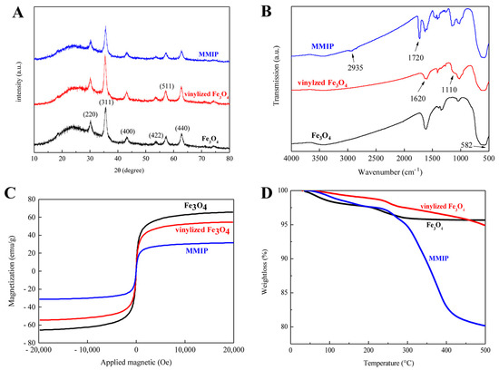 XRD patterns (A), FT-IR spectra (B), VSM (C), and TGA (D) of Fe3O4, vinylized Fe3O4, and MMIPs.