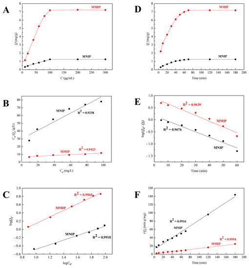 The kinetic adsorption curves in Figure 5D demonstrate that the adsorption of MMIPs increases fast before 60 min and reaches the adsorption equilibrium at 70 min, with a saturated adsorption capacity of 7.20 mg/g. The data in Figure 5E,F show that the pseudo-second-order kinetics model has better linearity and higher accuracy than the pseudo-first-order kinetics model. Moreover, in Table S3 (Supplementary Information), Q2c was closer to Qe than Q1c.