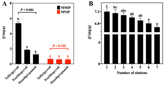 Selectivity (A) of MMIPs and MNIPs toward tolfenpyrad and its two structural analogs and the stability (B) of MMIPs (different lower-case letters indicate statistical significance between different treatments by Duncan’s multiple range test, p = 0.01).