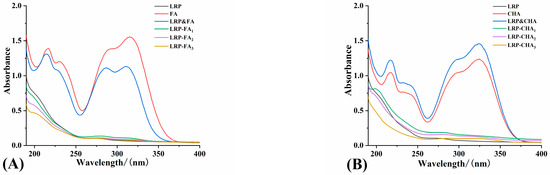 UV spectra of LRP-FA complexes (A) and LRP-CHA complexes (B).