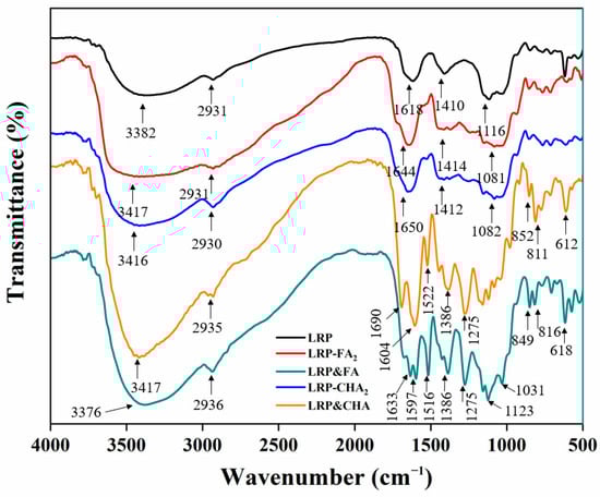 FTIR spectroscopy can provide structural information related to polysaccharide–phenol interactions [16]. As seen in Figure 2, the typical polysaccharide peaks of the LRP were confirmed [31], which included the stretching vibration (SV) of O–H at 3382 cm−1, the SV of C–H at 2931 cm−1, the SV of C=O at 1618 cm−1 and the SV of C–O at 1410 cm−1. Among them, the broad peak at 2931 cm−1 was attributed to the C–H stretching vibration of the LRP, which was also observed in the FTIR spectrum of the LRP–polyphenol complexes and mixtures. In addition, the SV of O–H in the LRP–polyphenol complex spectrum (at 3417 cm−1 and 3416 cm−1 for LRP-FA2 and LRP-CHA2, respectively) were broader than that in the LRP spectrum. It has been reported that the O–H stretching band was a sensitive indicator of the strength of the hydrogen bond, the O–H stretching band also shows a drastic change in its wave number and intensity depending on the formation of the hydrogen bonds and the broadening of the O–H stretching band was often observed in strong hydrogen bonds [32]. Here, it was suggested that the hydrogen bond was formed between the LRP and FA/CHA.