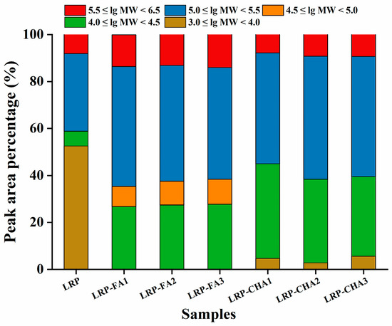 For the LRP, the increase in the Mw is one of the typical features associated with the noncovalent binding of polyphenols [15]. The effect of the polyphenol-binding ratio on the Mw distribution of the LRP–polyphenol complexes was determined by HPSEC-MALLS-RI. The chromatograms are shown in Figure S1, and the detailed information is collected in Table 2. The LRP consisted of seven fractions, with an average Mw of 146.3 kDa, of which the faction with the highest Mw of 1144 kDa accounted for 8.4% of the total peak area; by comparison, the LRP-FA and LRP-CHA complexes showed obviously higher values of the average Mw. Of all the fractions, the one with the highest Mw (1627 kDa, 14.1%) was found in LRP-FA3. The LRP contained 52.5% fractions within the low Mw range of 3.0 ≤ lg Mw < 4.0 (Figure 3). The low Mw fractions in the LRP-CHA1, LRP-CHA2 and LRP-CHA3, respectively, accounted for 4.7%, 2.8% and 5.6%, while those in the LRP-FA complexes were not detected. Moreover, the relative content of the fractions within the range of 4.0 ≤ lg Mw < 4.5 and 5.0 ≤ lg Mw < 5.5 significantly increased in all the complexes. No fraction below 1 kDa was found in the complexes, indicating that they did not contain free FA and CHA.
