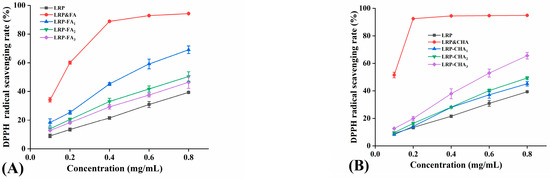 Previous studies indicated that the antioxidant activity of the LRP was relatively weak. Its IC50 value of DPPH radical scavenging was 1.65 mg/mL [17]. As natural antioxidants, phenolic compounds still retained their antioxidant activity when combined with soluble dietary fiber [35], and the antioxidant activity of their complex might be positively correlated with the phenolic binding amount [15]. As shown in Figure 4A,B, the noncovalent binding of polyphenols could effectively enhance the DPPH radical scavenging activity of the LRP. The scavenging capacity of the LRP-FA was significantly higher than that of the LRP (p < 0.05) and was positive to the FA binding amount. It might be attributed to the increased number of active hydroxyl groups, providing more protons to block the free-radical reaction [36]. Alejandra et al. also obtained similar results that a phenolic antioxidant (3,4-Dihydroxyphenylglycol, DHPG) linked to soluble dietary fiber maintains some antioxidant activity, and it was explained that the additional -OH group of the DHPG provided the availability of the catechol group and contributed to the antioxidant activity of the soluble fiber–DHPG complex. By comparison, the LRP-CHA complexes with higher polyphenol proportions did not show a prominent advantage in the DPPH radical scavenging. Moreover, their scavenging ability decreased with the increase in the CHA binding amount. The results implied that the active hydroxyl groups of the CHA in the complexes were significantly consumed due to the formation of intermolecular hydrogen bonds or inhibited by a steric hindrance. In addition, the LRP–polyphenol complexes showed a lower scavenging capacity than their physical mixtures, due to the reduction in active hydroxyl groups by the hydrogen bond formation [37]. The DPPH radical scavenging IC50 values of the LRP, LRP-FA1, LRP-CHA3, LRP&FA and LRP&CHA were 1.04, 0.47, 0.58, 0.17 and 0.10 mg/mL, respectively.