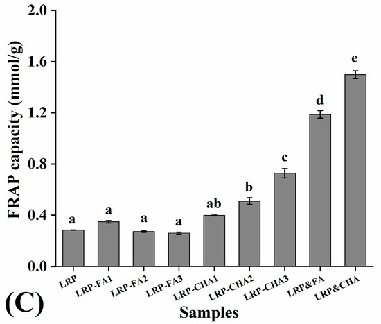 The FRAP capacities of the LRP and LRP–polyphenol complexes were also evaluated, as seen in Figure 4C. The FRAP value of the LRP was 0.29 mmol/g, which showed no significant difference with the LRP-FA complexes (p > 0.05). In comparison to them, the LRP-CHA2 and LRP-CHA3 possessed stronger FRAP capacities (p < 0.05), and the capacity showed a negative correlation with the CHA binding amount which was similar to the DPPH radical scavenging activity. In addition, the physical mixtures of the LRP and polyphenols exhibited higher FRAP values than their corresponding complexes (p < 0.05), indicating that the noncovalent interaction significantly decreased their FRAP capacity.