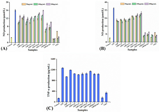 Macrophages kill pathogens not only directly through phagocytosis but also indirectly through the secretion of pro-inflammatory cytokines. When macrophages are activated, they release NO to kill microorganisms, parasites and tumor cells while inducing an inflammatory response to protect the body [39]. As seen in Figure 5A,B, the LRP and LRP–polyphenol complexes all stimulated NO production as compared to the control (p < 0.05), and the 48 h incubation had almost double the NO production of the 24 incubation. The FA and CHA had relatively weak effects on the NO production, and they both showed inhibitory effects on the immunostimulation of the LRP. However, the inhibition disappeared after the noncovalent binding of polyphenols to the LRP.