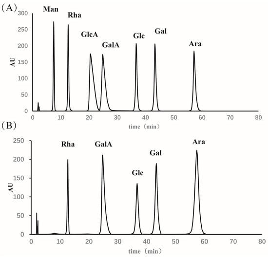 Eucommia ulmoides leaf polysaccharides were analyzed by high-performance liquid chromatography (HPLC). The polysaccharide was hydrolyzed with 2 M TFA at 110 °C for 4 h, and then PMP reagent was added for derivatization. A Cosmosil 5C18-PAQ column (4.6 × 150 mm) was used, and the detection wavelength was fixed at 254 nm for the analysis. The HPLC mobile phase consisted of a mixture of 80% 0.05 M KH2PO4 (pH = 6.9) and 20% acetonitrile. The injection volume was 20 μL and the flow rate was 1.0 mL/min [16].