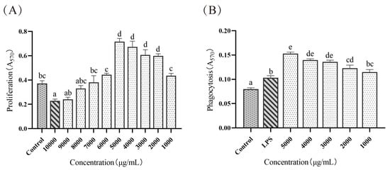 (A) The effect of ELP on macrophage proliferation of mice. (B) The effect of ELP on macrophage phagocytosis of mice. Different superscript letters are used to represent significant differences: bars with the same superscript letter indicate no statistical differences (n.s), while bars with different letters indicate pairwise p < 0.05. Six mice/group were used for this analysis.