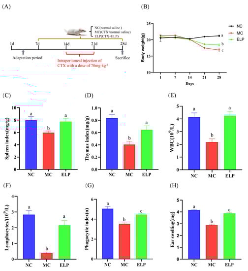 ELP administration inhibited CTX-induced impairment of body weight and the immune system. (A) Schematic diagram of the experimental procedures. Effect of ELP on changes in body weight (B), spleen index (C), thymus index (D), WBCs (E), lymphocytes (F), phagocytic index (G), and DTH reaction (H) in mice treated with CTX. NC: normal control group, MC: CTX-induced immunosuppression model group, ELP: ELP group, and the same as below. Data are represented as means ± SEM. Different superscript letters are used to represent significant differences: bars with the same superscript letter indicate no statistical differences (n.s), while bars with different letters indicate pairwise p < 0.05. Six mice/group were used for this analysis.