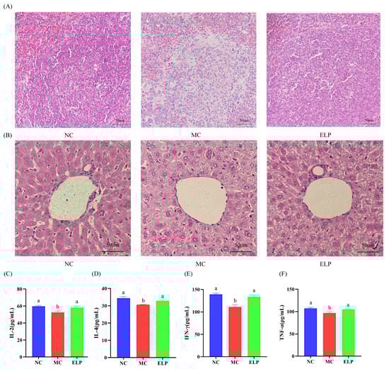 Detailed histological analyses of the spleen (A) and liver (B) in BALB/c mice. Scale bar: 50 μm. Effect of ELP on cytokines of IL-2 (C), IL-4 (D), IFN-γ (E), and TNF-α (F). Data are represented as means ± SEM. Different superscript letters are used to represent significant differences: bars with the same superscript letter indicate no statistical differences (n.s), while bars with different letters indicate pairwise p < 0.05. Six mice/group were used for this analysis.