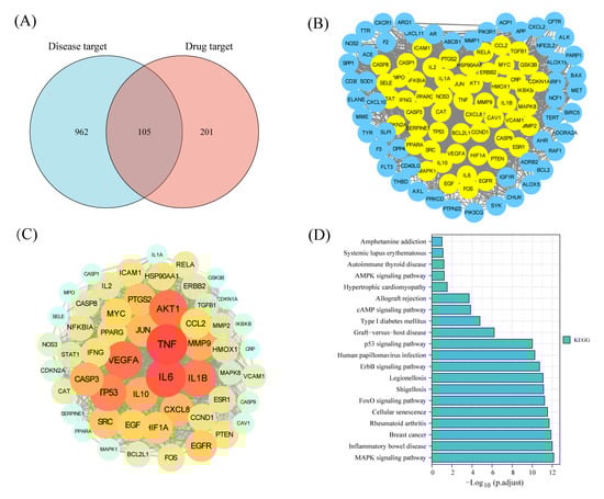 Network pharmacology prediction of ELP on immune dysregulation. (A) The intersection of ELP targets and disease targets. (B) Results of PPI analysis for potential targets of ELP. (C) A total of 21 core targets of ELP act on immune dysregulation. (D) KEGG enrichment analysis for the potential pathways of ELP.