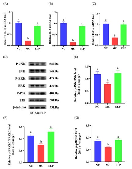 ELP inhibited the increase in inflammatory mediators induced by CTX (A–C). Comparison of the mRNA expression levels of IL-1β (A), IL-6 (B), and TNF-α (C) in different groups. ELP up-regulated p-JNK/JNK, p-ERK/ERK, and p-p38/p38 in the CTX-treated mice (D). Western blots of p-JNK, JNK, p-ERK, ERK, p-p38, and p38 in the spleens. A quantification of densitometric analyses was performed by measuring the expression ratios of p-JNK/JNK (E), p-ERK/ERK (F), and p-p38/p38 (G) in the spleens (n = 8 per group). ImageJ software was used to quantify immunoblot bands. Data are represented as means ± SEM, and a one-way ANOVA test was used to evaluate the statistical significance. Different superscript letters are used to represent significant differences: bars with the same superscript letter indicate no statistical differences (n.s), while bars with different letters indicate pairwise p < 0.05. IL-1β: interleukin-1 beta; IL-6: interleukin-6; TNF-α: tumor necrosis factor-α. Six mice/group were used for this analysis.