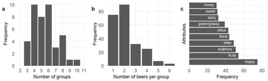 (a) Frequency of the number of groups formed by the panelists during the free sorting task (14 panelists × 3 sessions); (b) frequency of the number of beers sorted into each group; (c) frequency of the ten most commonly used attributes.