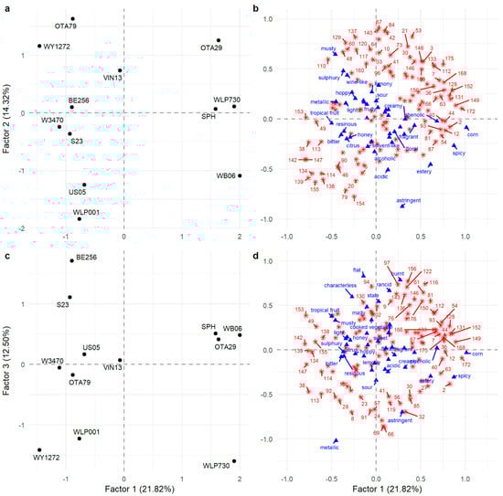 Separation of twelve beer samples (a,c) with sensory attributes (blue triangles) and VOCs (red asterisks) (b,d) on the MFACT plot on Factors 1–3. Labelled VOC numbers correspond to important contributors; refer to Appendix A, Table A2 for VOC identification.