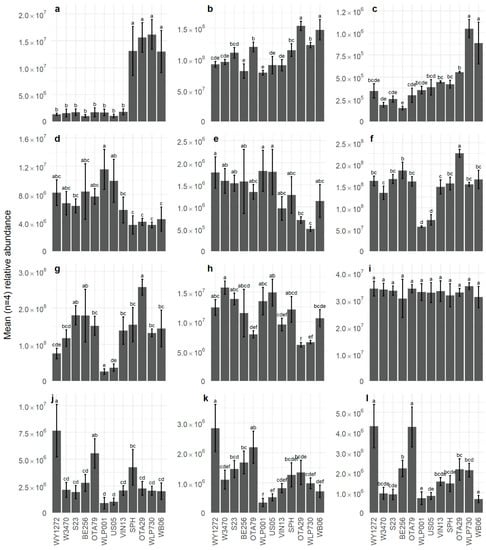 Relative abundance (deconvoluted peak area) of VOC in twelve beer samples. (a) 4-vinylguaiacol, (b) ethyl hexanoate, (c) dimethyl sulfide, (d) geraniol, (e) nerol, (f) isoamyl acetate, (g) 2-phenylethyl acetate, (h) citronellol, (i) linalool, (j) citronellol acetate, (k) nerol acetate, and (l) geranyl acetate. Values are plotted as means ± standard deviation. In each graph, samples sharing the same letter are not significantly different at p < 0.05. Note the different y-axis values.