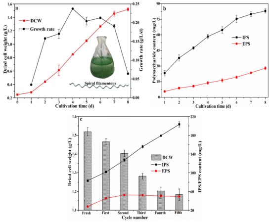 Growth of Spirulina platensis (a) and change of IPS/EPS (b,c) during cycle cultivation.