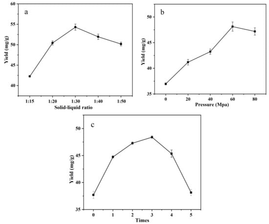 Single-factor experiments of variables’ mutual effect on IPS extraction. (a) Effect of solid-to-liquid ratio on IPS yield; (b) Effect of pressure on IPS yield; (c) Effect of times of extraction on IPS yield.