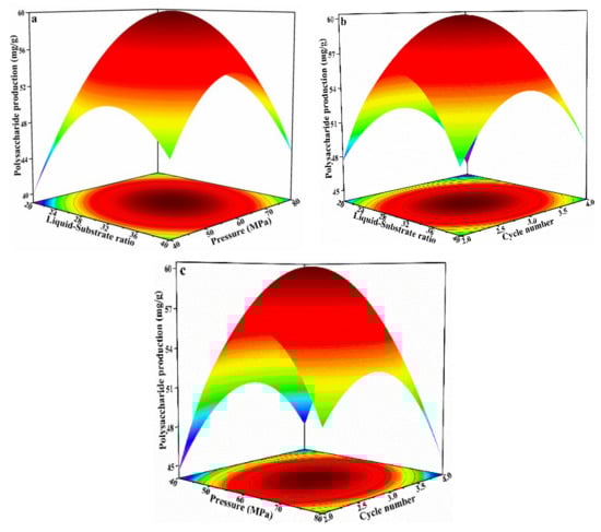 3D response profile of variables’ mutual effect on IPS extraction. (a) 3D response curve between liquid-substrate ratio and extraction pressure; (b) 3D response curve between liquid-substrate ratio and cycle number; (c) 3D response curve between pressure and cycle number.