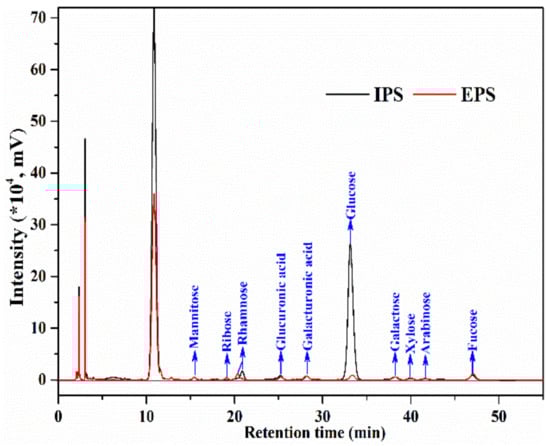Table 3 shows the chemical compositions of IPS and EPS. Both IPS and EPS contained more than 65% total sugars and less than 5% protein. The phenolic content in IPS (7.3%) was higher than in EPS, indicating a stronger antioxidant capacity. The carbohydrates present in both IPS and EPS but in different ratios (Figure 4) included mannitol, ribose, rhamnose, glucuronic acid, galacturonic acid, glucose, galactose, xylose, and fucose. However, the proportion of each monosaccharide content was statistically significantly different in IPS vs. EPS (Table 3). IPS’s main monosaccharides were glucose (83.62%), rhamnose (4.42%), fucose (3.25%), and glucuronic acid (2.39%). In comparison, EPS contained mainly fucose (19.99%), rhamnose (15.61%), glucose (14.75%), galacturonic acid (11.13%), and galactose (10.78%) content, and had a lower molecular weight (185.13 kDa). This indicated that IPS may have a higher viscosity than EPS []. These differences in monosaccharide content and Mw between PSP fractions point to remarkably distinct functional properties and potential when used as food additives e.g., as thickening stabilizers.