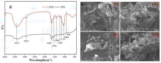 The FTIR spectra of IPS and EPS indicated large similarities in the functional groups contained in both polysaccharide fractions (Figure 5a). The absorption peaks observed at around 3413 and 2925 cm−1 are typical of the O−H and C−H stretching vibrations in rhamnose and fucose, respectively []. The amide I band at 1650 cm−1 can be taken to represent the symmetrical and asymmetrical stretching vibration of C=O in COO− and −NHCOCH3, together with the bending vibration in the N-H bond []. Similarly, the amide II band with peak absorption at 1542 cm−1 can be mainly attributed to the symmetrical stretching vibration in the C−O bond. Next, absorption peaks at 1400–1200 cm−1 represent variation angle vibrations. The absorption peak at 1240 cm−1 can be attributed to the asymmetrical stretching vibration in −S=O, indicating that both IPS and EPS contained a small number of -SO3H groups []. The presence of the pyran ring and the carbohydrate skeleton (C−O−C) is indicated by their characteristic peaks at 1153 and 1064 cm−1, respectively []. Finally, the absorption peaks at 898 and 819 cm−1 correspond to the deformation mode of the β−D−pyranoside bond (C−H) and α−Mannitose, respectively [].