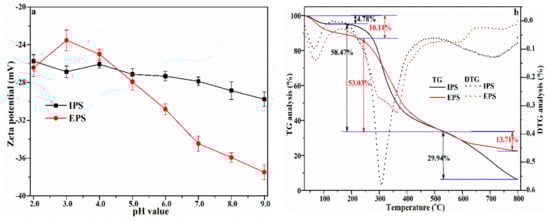 Zeta potential curves (a), TG/DTG curves of EPS and IPS (b).